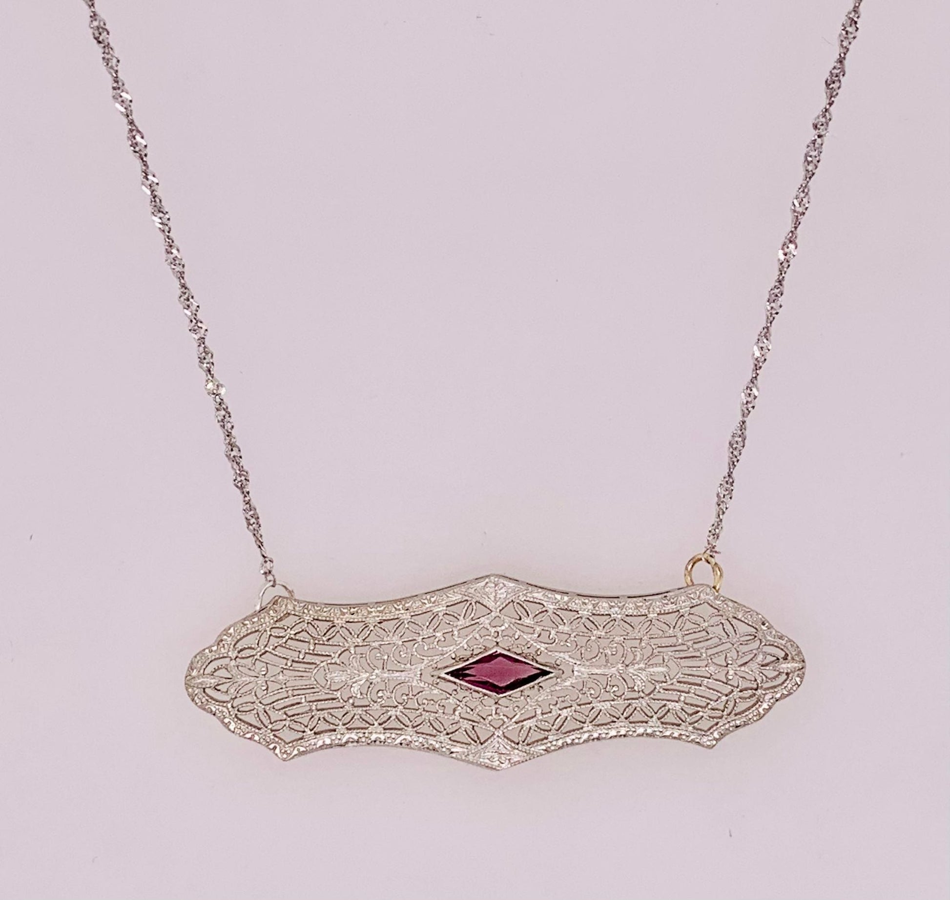 14K white gold 18 pendant created from an antique bar pin. Purple amethyst colored stone.