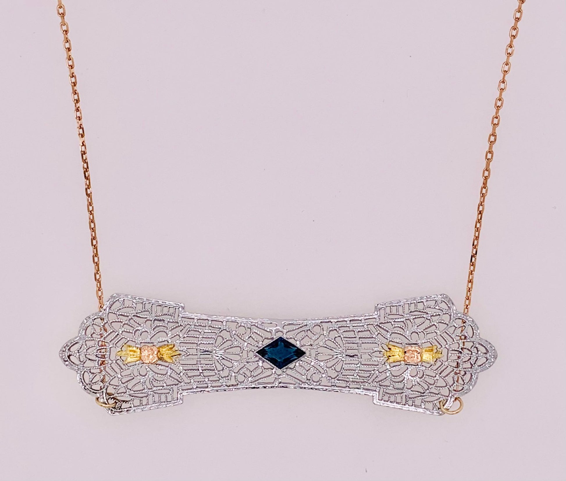 14K white and rose gold 17-18 pendant created from an antique bar pin. Blue sapphire colored stone.