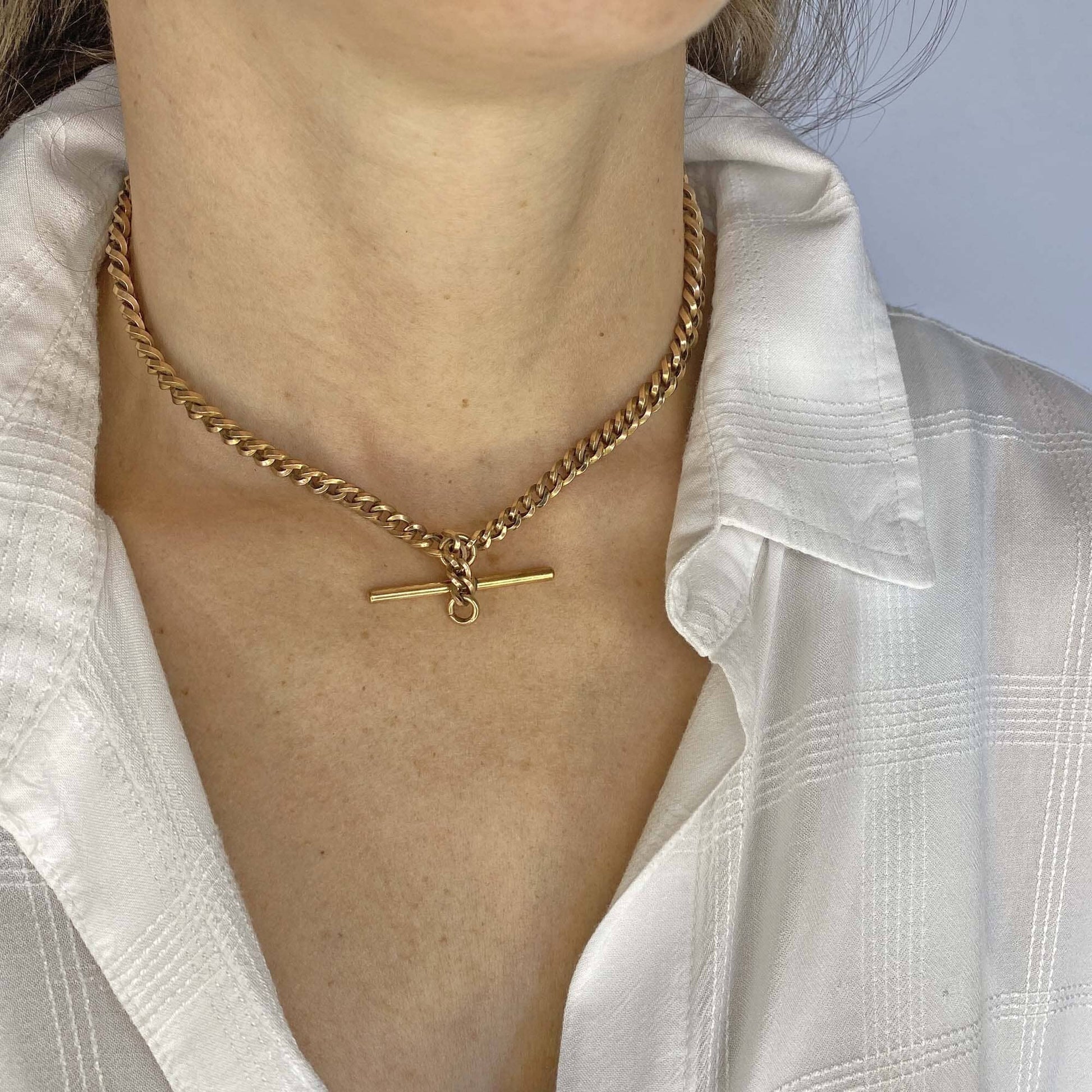 Handsome antique double Albert pocket watch chain in a rich rolled gold that can double as a necklace or bracelet. The graduated heavy curb chain has a center t-bar and matching drop chain ready to add a fob with each end having a swivel dog clip. A striking Albert chain to wear with a pocket watch for the gents, wear as a necklace for the ladies, or wrap around your wrist for a unique look!